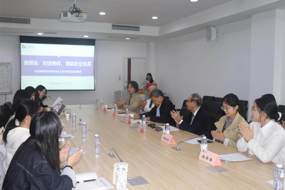 2025年10月31日下午,社会发展学院党委、关工委主办,人口所硕士研究生党支部承办的“良师说:对话榜样,领航职业生涯”活动在法商北楼525圆满完成。本次活动为社会发展学院“教风学风主题建设系列活动”之一。院党委副书记兼副院长、院关工委主任庞荣,人口所终身教授、院关工委副主任桂世勋,人口所副教授、退休教工党支部书记王大犇,教育部注册优秀创新创业导师王翀,上海长虹善心团队联合创始人周魏巍,以及校友华东师范大学教育学部辅导员梁梦婷、上海外国语大学尚阳外国语学校教师肖菁菁等嘉宾出席。学院党委专职组织员李媛媛主持。
