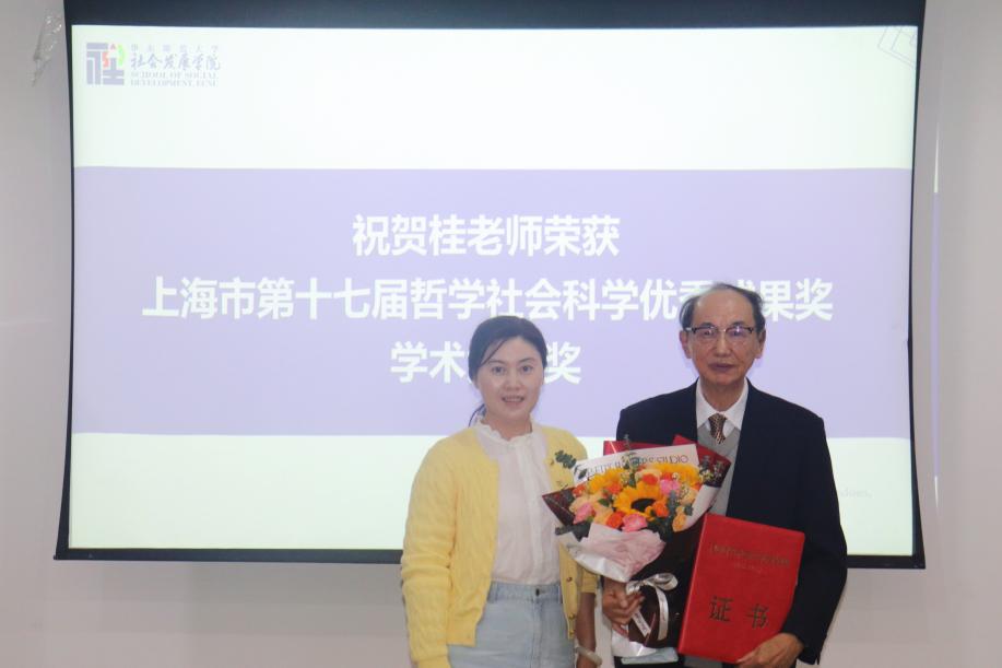 活动开始之前,社会发展学院党委副书记兼副院长庞荣代表学院向人口所终身教授桂世勋赠送鲜花,热烈祝贺桂教授荣获上海市第十七届哲学社会科学最高奖项“学术贡献奖”。桂世勋教授是首位在人口学领域获此殊荣的学者。他是中国人口社会学、老年学及社会保障研究领域的奠基人之一,曾获得国家级“有突出贡献的中青年专家”“中华人口奖”“中国老年学杰出贡献奖”等重要荣誉,其学术成果为中国养老保障体系、老龄政策制定做出了卓越贡献。