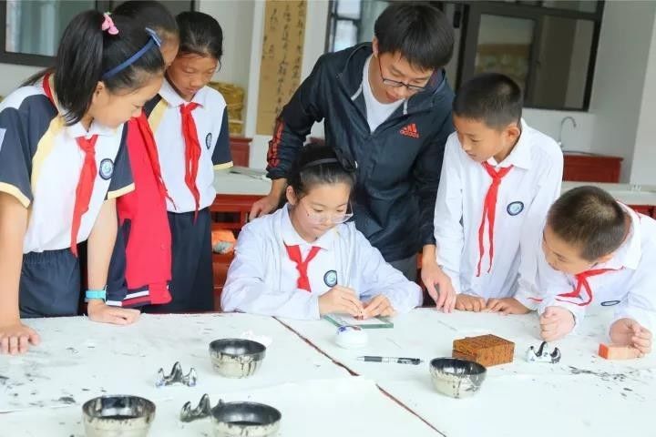 顾文俊老师指导泗泾第三小学的学生使用印泥