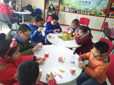 在最后一个环节,志愿者分组教学,教小朋友如何用纸杯、筷子、胶带等材料,制作灯笼。在志愿者的耐心指导下,小朋友很快就学会了做灯笼。几个心灵手巧的小女孩很快就把自己的灯笼做好了,但当她们看到还有好多小朋友还没有完成的时候,善良的她们主动地帮助他人制作灯笼。