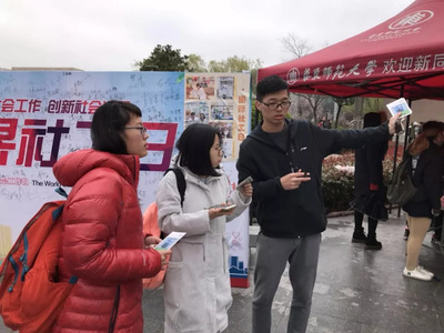 3月21日11:30,华东师范大学“国际社工日”活动在华闵食堂前顺利举行。本次“国际社工日”的主题为“促进社区和环境可持续性”,由社会发展学院社工系的同学们与利群社工事务所、上海交通大学医学院附属第九人民医院的实习社工们共同举办。他们准备了精彩纷呈的活动,在向大家介绍社会工作这一新兴专业的同时,也给大家带来了温暖与笑容,为国际社工日送上华师同学们的真诚祝福。
