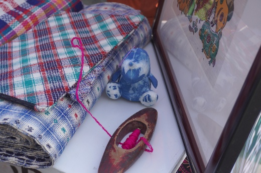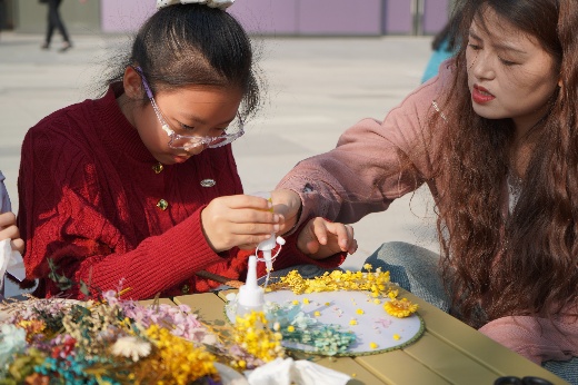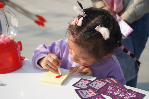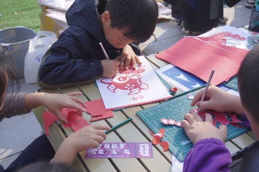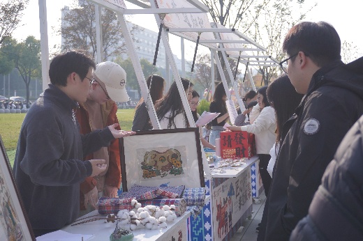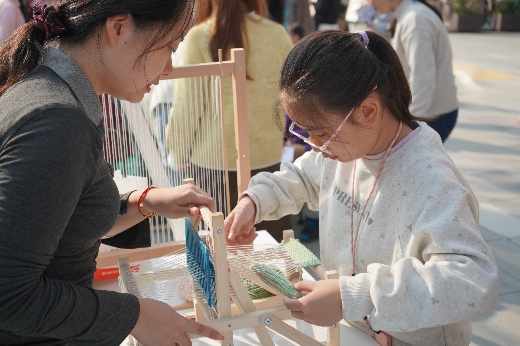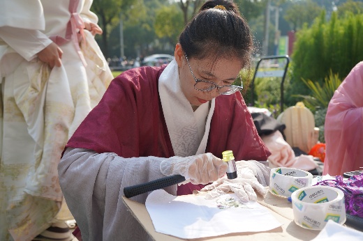 在非遗文化展示与体验区,汉服、棉布、年画等淋漓尽致地展现了传统工艺之美,也生动体现了我院民俗学聚焦物质文化与活态传承的研究特色。鲜明地彰显了我院民俗学的研究方向。香囊、植物拓印、剪纸、织布机、螺钿、团扇等非遗手工体验吸引了很多小朋友的参与,既让大家在实践中近距离感受到非遗魅力,又实现了非遗在新一代青少年中的传承。人口所硕士研究生党支部书记金祥盈介绍,本次体验活动是支部“衣被天下 浓情社发”非遗文化体验系列活动之一,由支部、汉服社、乡土建设学社共同负责,旨在传承非遗文化,以文化体验强化思想引领,推动党建与专业学习的深度融合。