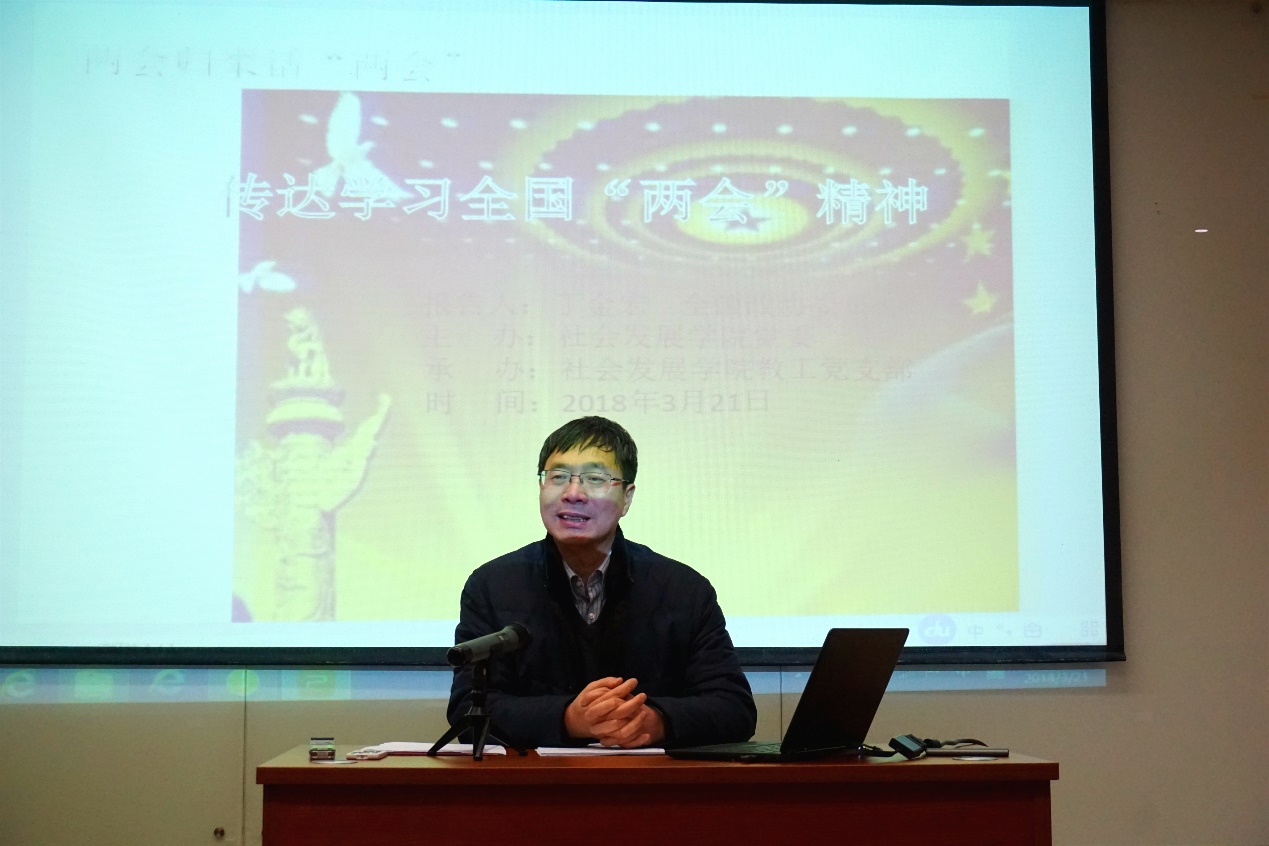 2018年3月21日下午,华东师范大学社会发展学院党委邀请全国政协委员、人口所所长丁金宏教授,在法商北楼一楼报告厅,为全院教师及学生党员骨干做“传达学习全国‘两会’精神”报告会。报告会由学院党委书记熊琼主持。