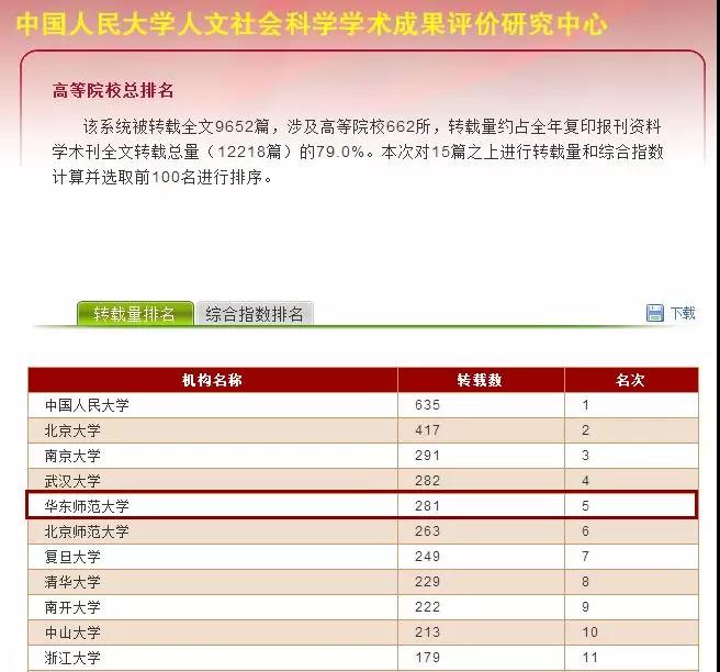 在高等院校复印报刊资料转载指数总排名中,华东师大转载数为281篇,转载数和综合指数均位列第五。从分学科看,在17个学科中,华东师大进入全国高校前十的学科达10个。其中,我院社会学转载数量居全国第4,综合指数居全国第6,转载数量排名较2016年上升2位,综合指数排名不变。