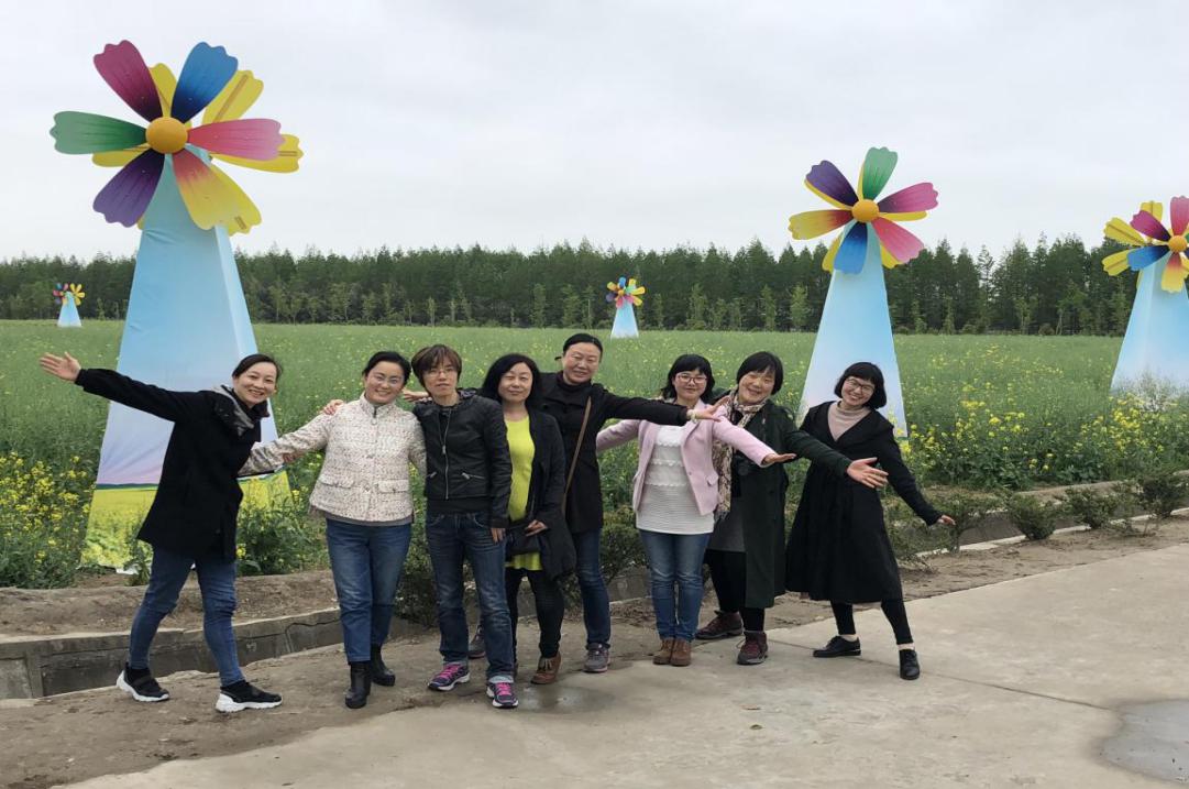 在奉贤庄行油菜花园千米绿色的观光大道上,各位女教师们共同观赏了万亩油菜花田、麦田、风车和果园。尽管阳光并没有预期的明媚,但是毫不影响老师们欢快的心情。看她们脸上绽放的笑容、跳动的身姿,那么优雅、那么快乐!