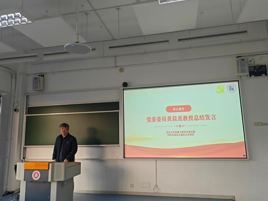 在完成民主评议后,党委委员黄晨熹教授对本次组织生活会和民主评议会进行总结讲话。他充分肯定了会议准备充分、程序规范、批评深刻、氛围严肃。同时,黄晨熹教授结合专业特点对支部和党员提出殷切期望:一是要持续深化理论武装,建立常态化学习机制,不断提升政治素养;二是要积极探索党建与专业深度融合的新路径,发挥社会工作专业优势,打造具有专业特色的党建品牌项目,例如在社区服务、老年社会工作、数字社会工作等领域挖掘实践与服务的结合点;三是要强化党员先锋意识,在学术科研、社会实践、服务同学中亮身份、作表率,真正发挥党员的引领带动作用。