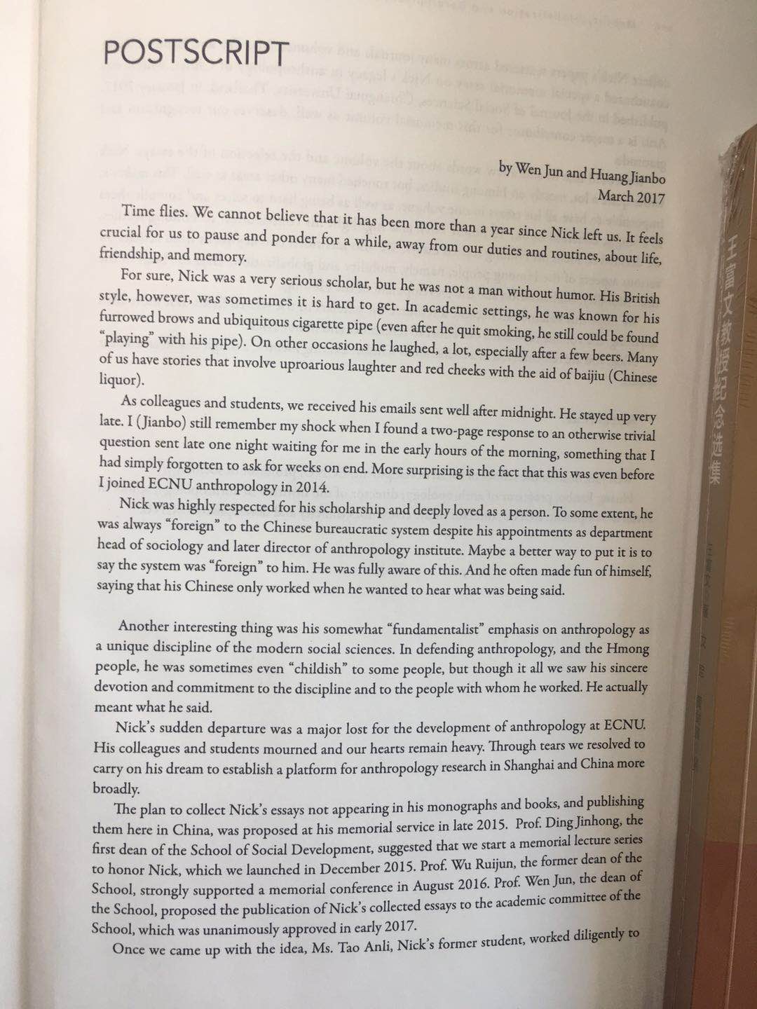 现下再添一个可以触碰的方式,让大家得以睹书思人。蒙华东师范大学出版社的支持,我们从王富文老师散见各处的文章选编了一本纪念性文集,题为“Mobility, Globalization and Development Of The Hmong: selectedessays of Nick Tapp”。社会发展学院建院以来的先后三任院长丁金宏教授、吴瑞君教授、文军教授全力支持本书的选编和出版,王富文老师的学生陶安丽、王蕾作为特约审读,投入了大量的时间和精力,做出了可圈可点的贡献。本书的出版得到华东师范大学社会发展学院的倾力资助,充分彰显了社会发展学院开放多元、与时俱进的治学态度。更为重要的,本书表达了全院上下对于作为挚友的王富文老师之深刻怀念以及追思。