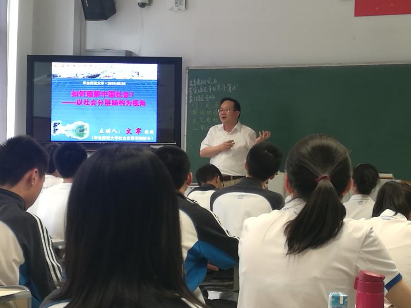 5月24日下午,我院院长文军教授也到华师二附中人文班进行“如何理解中国社会?——以社会分层结构为视角”为题的讲座,从社会关系、问题、制度等入手,纵论当今中国的社会万象。同时,我院社会学系魏伟教授成为二附中咨询专家。