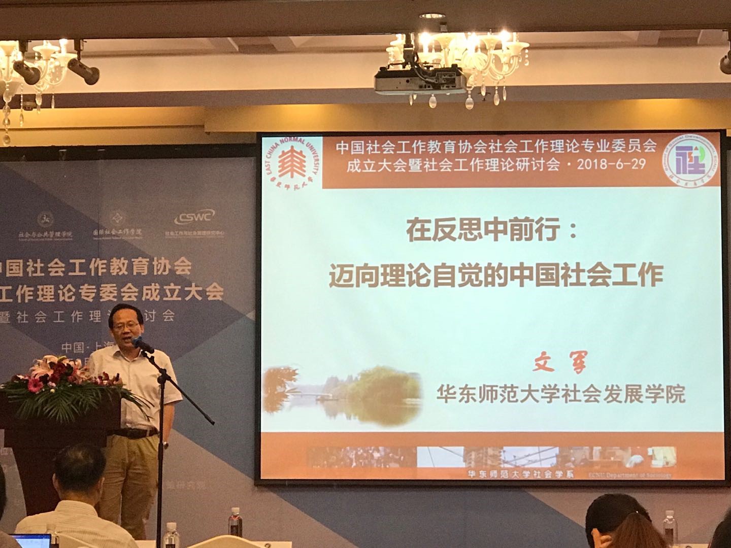 会议同时举办了“全国社会工作理论研讨会”,来自北京大学、浙江大学、复旦大学、中国人民大学、南开大学、吉林大学、厦门大学、西安交通大学、北京师范大学、中央民族大学、中国社科院大学、华东师范大学、华东理工大学、华中师范大学、中国政法大学、上海大学等百余所大学的160余名学者参会。文军教授在大会上做了题为“在反思中前行:迈向理论自觉的中国社会工作”的主题发言。