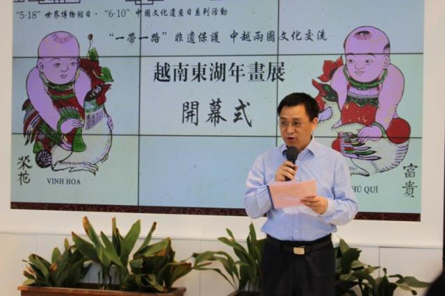 汪荣明在致辞中指出,越南是中国山水相连的友好邻邦,也是中国建设21世纪海上丝绸之路的重要一站。本次画展具有很强的艺术观赏性,又蕴含丰富深厚的文化内涵,既为我们鉴赏年画艺术、了解古代丝绸之路中越经济文化交流提供了难得的机会,也寄托了我们增进两国人民的相互了解与友谊,实现民心相通,助力“一带一路”建设的美好祝愿。