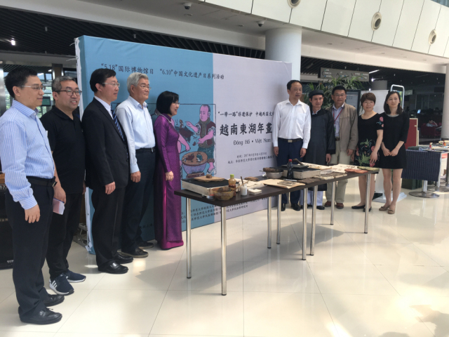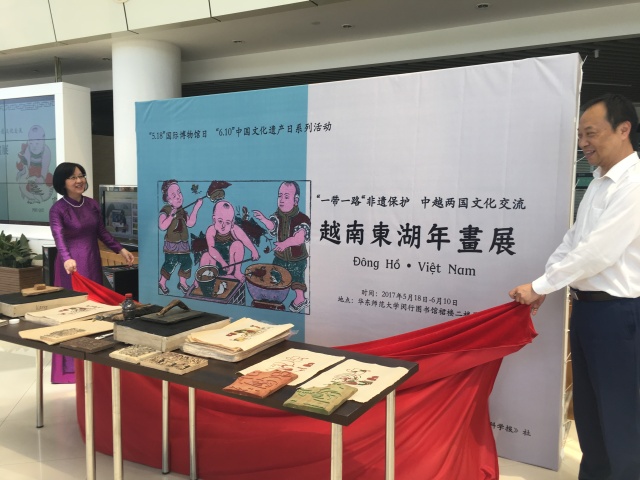 5月18日,由华东师范大学校园文化建设委员会和华东师范大学博物馆联合主办,华东师范大学民俗博物馆和华东师范大学民俗学研究所承办的“一带一路非遗保护 中越两国文化交流——越南东湖年画展”在闵行校区图书馆开幕。越南驻上海总领事馆总领事阮青梅、越南国家级非物质文化遗产传承人阮友果,我校副校长汪荣明、戴立益,博物馆建设委员会顾问龚若栋,社会发展学院党委书记熊琼、副书记黄燕、副院长田兆元、人类学研究所所长黄剑波、民俗学研究所副所长范长风以及校内外嘉宾和师生们共同参加了开幕式。开幕式由学校博物馆负责人汤涛主持。