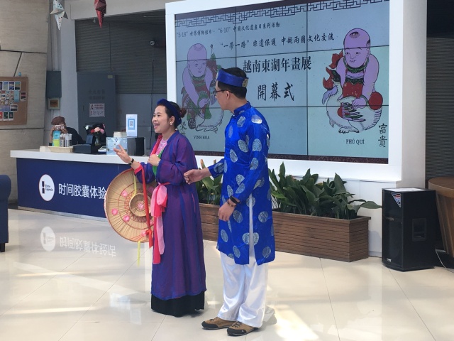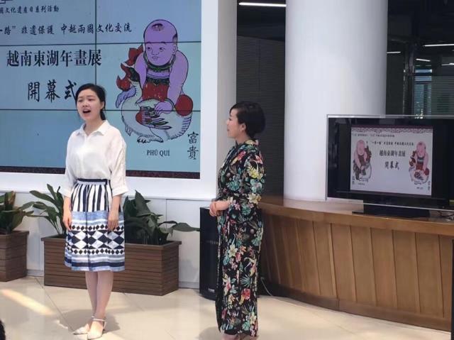 开幕式上,戴立益和阮青梅分别代表华东师大和越南驻上海总领事馆为东湖年画展揭幕。随后,阮有果和越南留学生在现场分别进行了越南东湖年画创作表演和越南传统歌舞表演。音乐学系石春轩子及其弟子王丽云一同演唱了《芦花》《刘三姐》,高超的演唱水平,令人称奇,把气氛带入高潮。参加开幕式的嘉宾和师生们一起进行了年画的现场拓印体验并参观了展览。