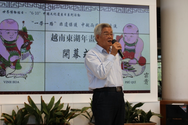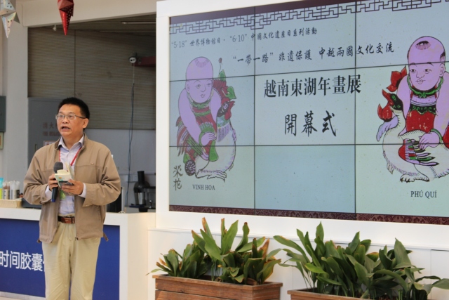 策展人田兆元介绍了本次越南东湖年画展的目的和意义。他说,博物馆建设是国 家文化战略,在国家文化传承,社会教育中发挥着重要作用。本次越南东湖年画展始于十多年前越南留学生的学习交流,是“一带一路”中越两国文化教育交流活动的珍贵历史再现。民俗博物馆将积极推进越南东湖年画的展览馆的建设,为“一带一路”的文化交流贡献力量。