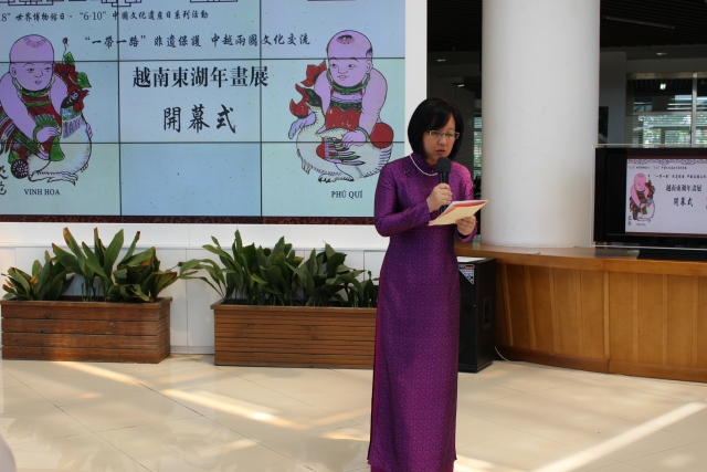 阮青梅在致辞中说,越中两国山水相连、制度相同、文化相通,今天举办的年画展是两国文化交流的生动体现。东湖年画有500多年的历史,是闪烁着越南特色的民间画,画作《荣华》、《富贵》风格淳朴,反映了越南人民日常生活,表达了越南老百姓的向往和追求,希望通过这一活动,有更多的中国朋友去越南交流,增进两国人民的了解。