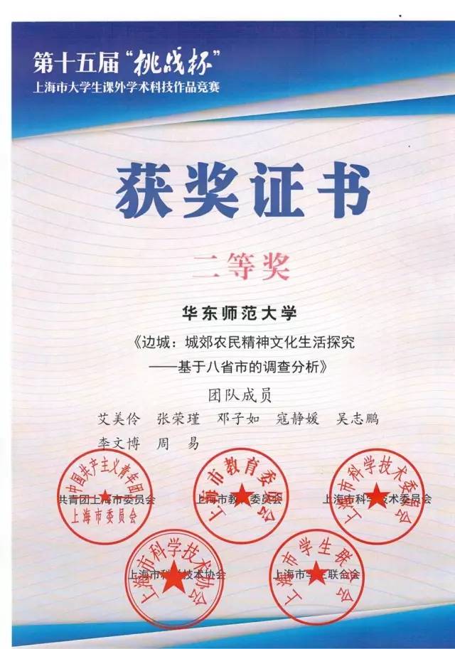 2017年6月9日至10日,由共青团中央、中国科协、教育部、全国学联和上海市政府共同主办的第十五届“挑战杯”上海市大学生课外学术科技作品竞赛在上海工程技术大学隆重举行。来自上海市40余所高校的数千名学生同台竞技,共展风采。我院选送的社会类作品《边城:城郊农民的精神文化生活探究——基于八省市的调查分析》作品荣获二等奖。该作品的参赛成员为艾美伶、张荣瑾、邓子如、寇静媛、吴志鹏、李文博、周易,指导教师为文军教授。