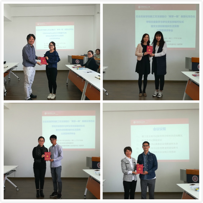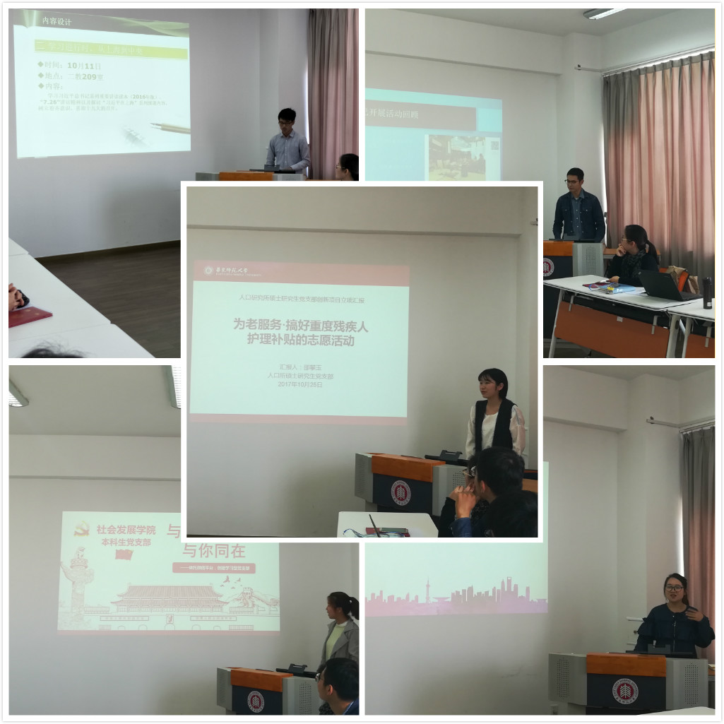 结对仪式完成后,开展本学期创新组织生活实例立项答辩评审会。博士生支部围绕十九大报告精神、新党章内容,开展经典著作读书会,举办跨学科工作坊活动;社会学研究生支部结合专业优势,结合时事热点,如农村建设、环境议题,单身问题等开展“茅庐论天下——时事研讨营”活动;人口学研究生党支部以十九大报告提出的“发展残疾人事业,加强残疾康复服务”为契机,开展为老服务与残疾人帮扶志愿活动;社会工作硕士研究生党支部以“学习、贯彻十九大报告”为两条主线开展公益志愿服务;本科生党支部发挥传统党建品牌项目,做强做精《时事周报》,传递时事新闻,并与社会学研究生党支部进行联合组织学习。