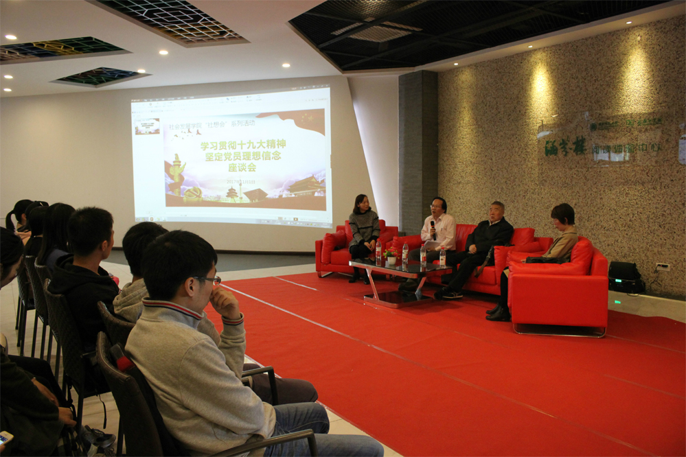 在交流环节中,学生党员们也围绕党的十九大精神表达了自己的想法,就如何解决现阶段主要矛盾、如何将十九大报告描绘的我国未来发展的宏伟蓝图内化到党员的具体行动中等一系列问题跟老师们展开了深入的交流。“青年兴则国家兴,青年强则国家强”,此次学习报告会作为“社想会”系列活动的开场,取得了良好的效果。不仅仅是思想的交流,也是思想的互动,信仰的互动,通过交流和互动逐步加深了大家对党的十九大精神的认识,不断坚定自己的人生追求和信念。后期学院党委还将陆续推出学习贯彻十九大报告精神系列活动。希望可以促进我们每一个基层党员以只争朝夕的紧迫感和历史使命感、责任感,立足岗位,奋发有为,正如习近平总书记在对青年人的寄语中说到:“青年人要到人民和基层中去,让青春之花绽放在祖国最需要的地方。”今日的时代,我们距离中华民族伟大复兴目标从未如此之近。当下的中国,比任何时候都更需要信仰的光芒和力量。