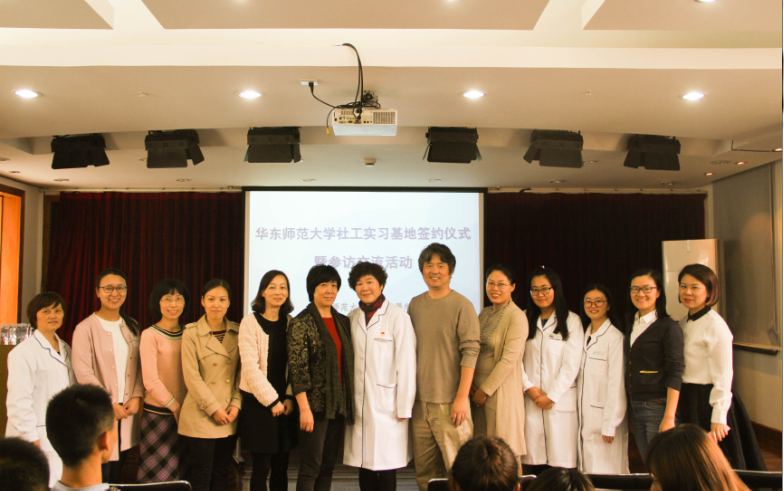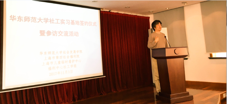 2017年11月3日,华东师范大学社会发展学院2017级社会学大类本科生前往上海市第四福利院(以下简称市四福院)进行实习参访学习和交流,本次亦举行了社会工作系与市四福院以及上海市儿童临时看护中心(以下简称市看护中心)共建专业实习基地的签约授牌仪式。上海市社会福利中心社会服务科科长唐凤娟、市四福院副院长(主持工作)姜学勤、市看护中心社工部负责人郑会芳、社会发展学院副院长、社会工作系主任黄晨熹教授、党委副书记黄燕副教授、以及社会工作系赵鑫、王海萍、郭娟,辅导员沙炜娟、教学秘书应萍儿几位老师、福利中心社工学组成员共八十余人参加了本次活动。