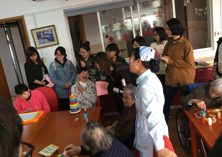 签约仪式结束后,来访师生加入社工体验活动和参访。在体验活动中,上海市第三社会福利院社工王晨琳等提前设置虚拟场景,让同学们亲身感受到老年人生活上的不便,如视力下降、手脚不灵活等,社工循循善诱,从最简单的个人感受问到作为社工可以为老年人做些什么,同学们陷入了深思。黄晨熹教授分享道:“作为社工,更应该关注那些‘看不见的人’,即最边缘的弱势群体,社工需要运用专业知识来服务社会。”赵鑫老师引导同学们从体验中看到未来的自己,关注老年人的福利就是关注未来的自己。参访环节中,大家参观了乐活农场、颐园和娱疗室。乐活农场是社工在充分了解老年人需求而利用专业知识设计出的项目,旨在发挥不同老人的能力,加强合作,让老人们通过植物感受生命的过程,从而达到全面增能的效果。娱疗室是福利院为失智老人提供的治疗场所,老人们围坐在一起搭积木、玩拼图,同学们或与社工交流,或与老人共同娱乐,旨在延缓老人们的病情,促进交流。颐园是坐落在市四福院内的一个私家园林遗址,定时向老人开放,以供老人休息,并在节假日举行游园等活动。